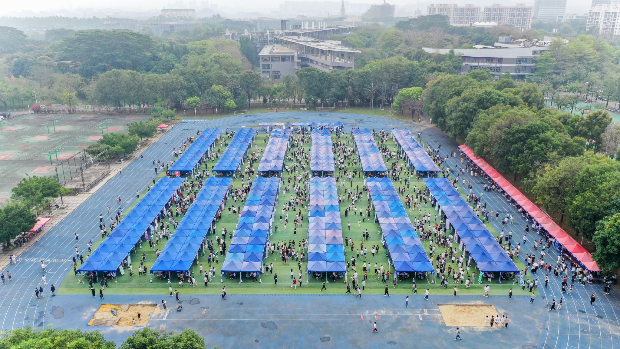 上午9:30,松山湖校区假草田径场热闹非凡。各招聘单位准备就绪,求职者们满怀期待、信心满满,手持简历,寻找心仪的岗位。