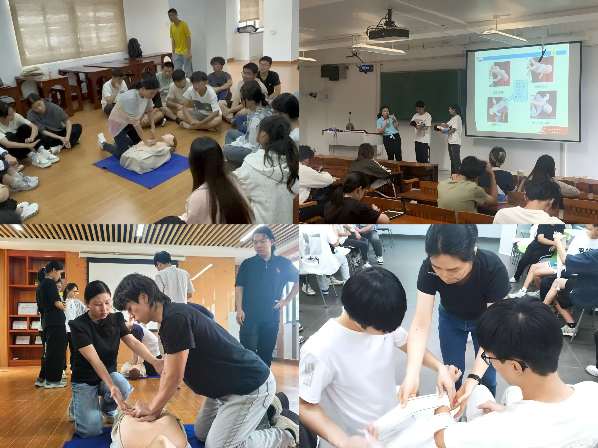 为深化教学成效,学校构建了多元化的急救育人体系:自2022年起将“应急救护大赛”纳入年度科技学术节重点赛事;协同校医务室整合优质资源,特邀市疾控中心、松山湖社区卫生服务中心等专业机构打造“急救知识进校园”系列知行讲堂;培育专业化的“知行护航”导生志愿服务团队,结合“双百行动”深入居民社区开展急救知识普及教育。通过多维度、立体化的育人举措,在校园内外营造了“人人学急救,急救为人人”的浓厚氛围。