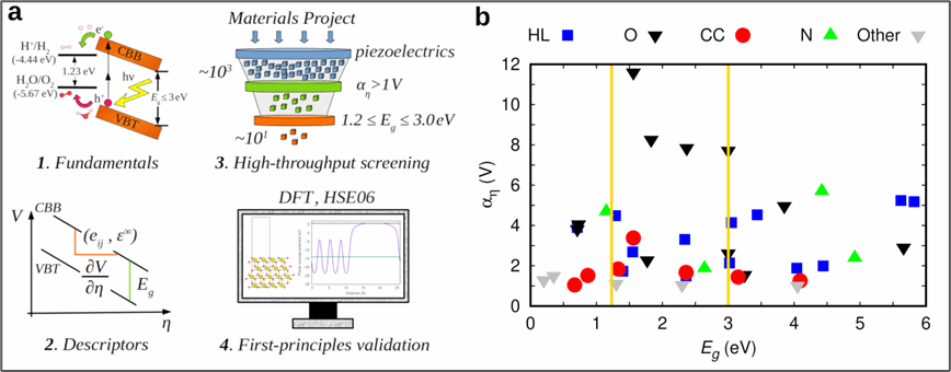 由于压电材料能通过对机械刺激的响应来改变其能带带隙和能带排列(band alignment),并且压电效应产生的内电场能够很好地阻碍光生空穴-电子对的复合湮灭,因此为精确的光催化剂设计提供了可能的途径。然而,压电光催化剂相对较少,并且迄今为止相关研究并不充分。基于以上,该团队提出了一个高通量筛选压电光催化材料的方法。该方法在压电材料数据库中对1000多种材料进行DFT计算,依靠一个简洁可靠的静电模型,成功筛选出多个性能优异的压电光催化材料。