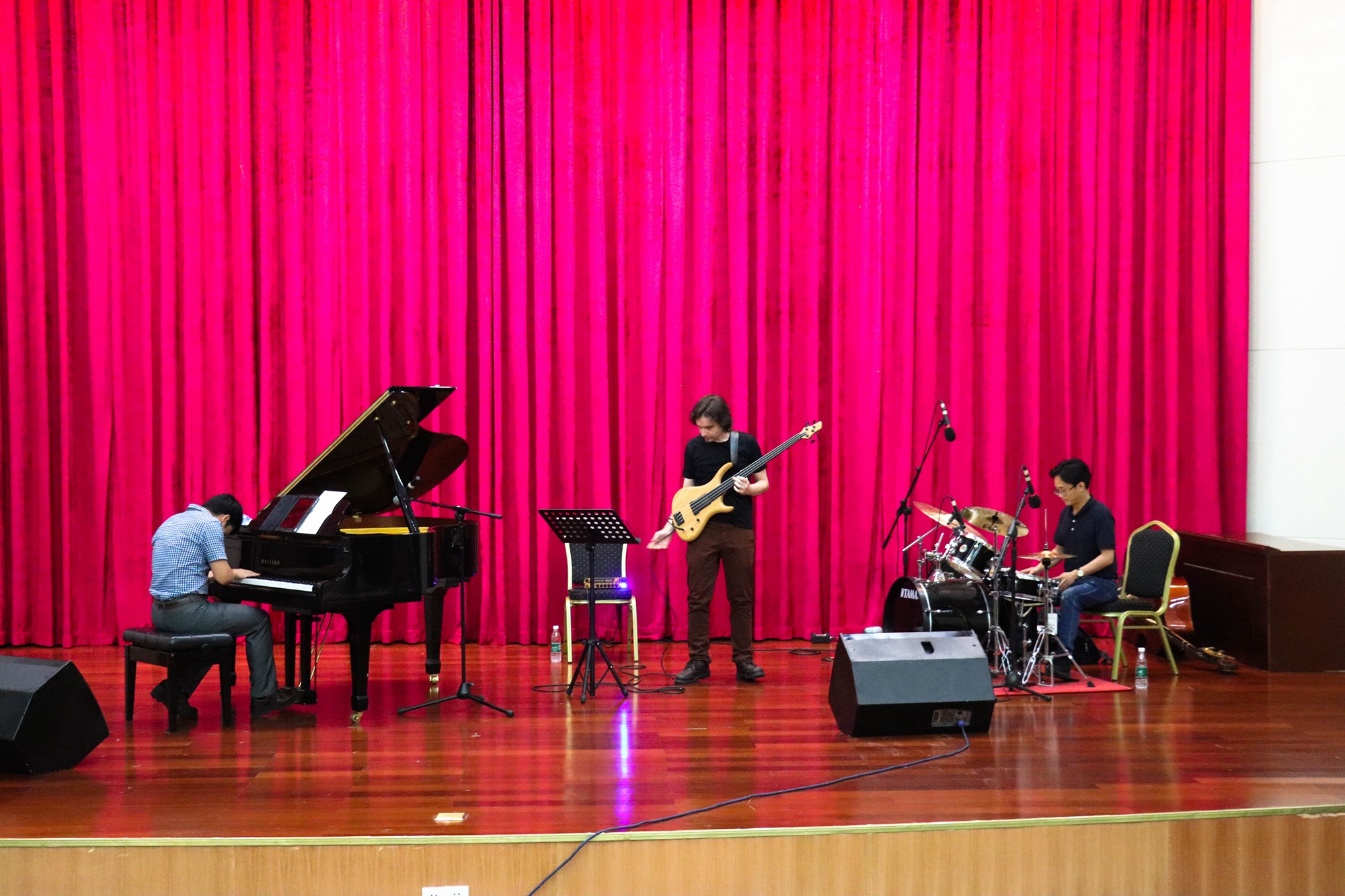 讲座开始前,林昶、苗磊、Mika三人共同演奏了《footprint》、《allthethingsyouare》两首曲目。伴随着Mika低沉多变的贝斯律动,林昶的手指在琴键上自由飞舞着,而苗磊的鼓点声时而像细雨细碎,时而又如大雨突至,三人相互配合,给现场观众带来了一场听觉盛宴。