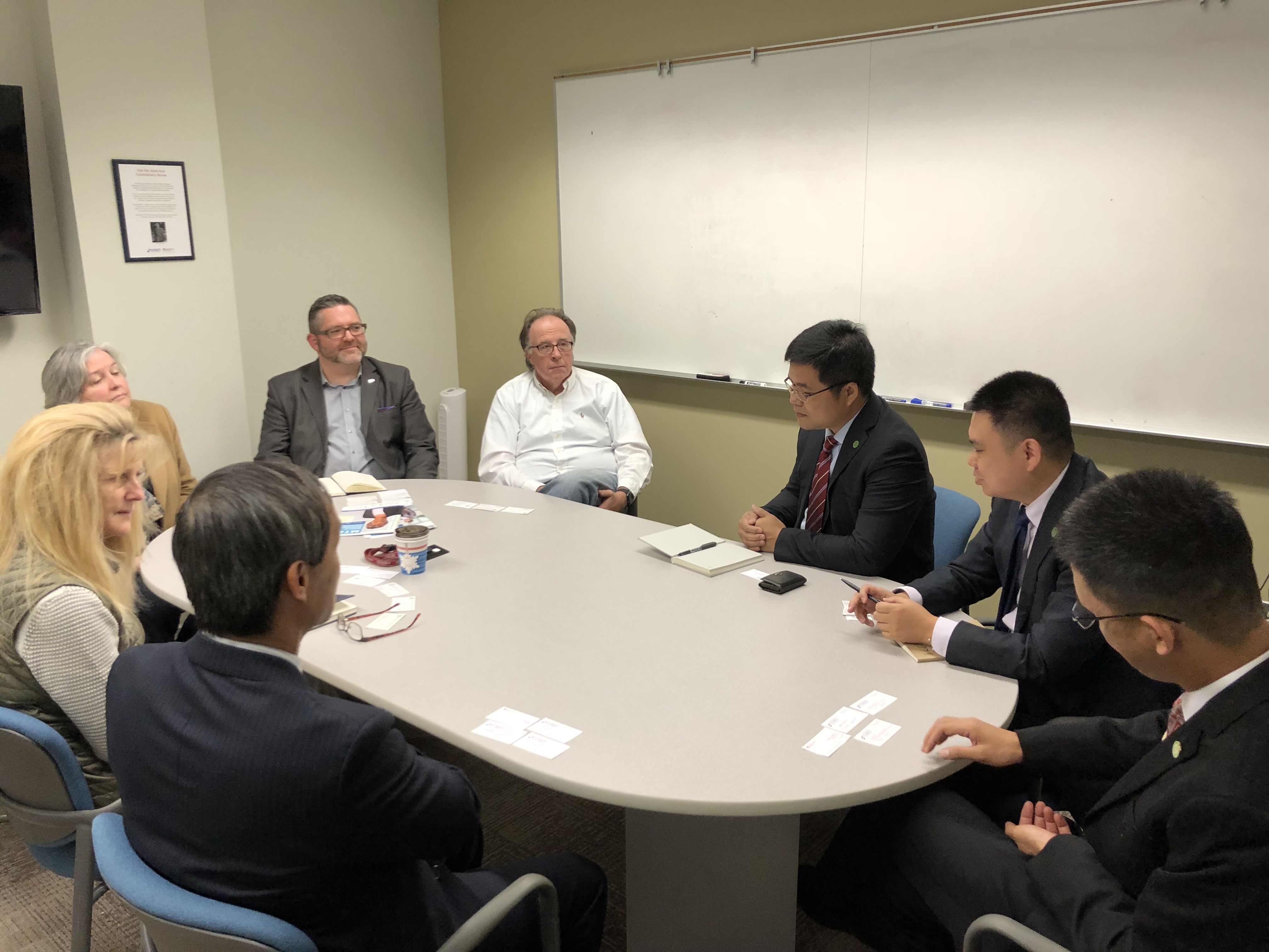4月13日,访问团一行来到美国新墨西哥大学,分别与该校安德森商学院有关负责人、国际处全体成员举行了会谈。会谈中,双方回顾了前期合作项目的进展情况,确定了开展投资学创新班的合作意向,并就学生赴新墨西哥大学参加暑期课程、创新创业孵化营以及探索开展其它形式的学生联合培养进行了讨论。