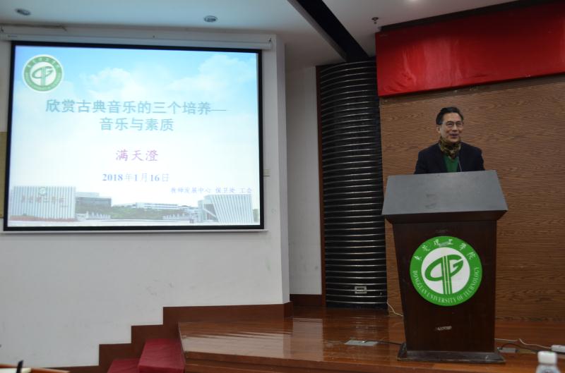 1月16日,由教师发展中心、工会、保卫处联合举办的“欣赏古典音乐的三个培养”讲座在松山湖校区学术交流中心报告厅举办,讲座由从事艺术教育教学三十多年的解放军南京政治学院满天澄教授主讲,保卫处处长张力、教师发展中心主任李环及150多位师生参加了讲座。