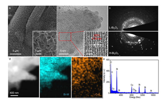 本文报道了一种在碳纸基底上垂直生长的氧化铋纳米片电极,作为水系碱性电池的负极表现出了良好的电化学性能。同时,该工作表明结晶度在改善电化学储能方面有重要的作用。该方法制备的高结晶度氧化铋电极在4 mA/cm2电流密度下达到了0.14 mA h/cm2的容量,并且5000圈循环充放电后容量保持率高达71.4 %。这项工作为高性能水系碱性电池负极材料的设计与构筑提供了崭新的视角和全新的思路。