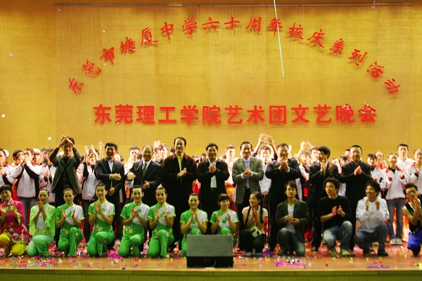 2007年12月7日晚, 我院艺术团应邀前往东莞市塘厦中学为庆贺塘厦中学六十周年校庆献上了一场精彩的演出,出席晚会的嘉宾有我院领导周致纳、杨晓西、王江水,塘厦镇领导叶锦河、郑兆鹏等。在文艺演出前,郑兆鹏和王江水分别为晚会致辞,塘厦中学校长黎灼辉向我院院长杨晓西赠送了锦旗。。