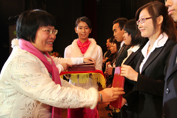 黄碧莲副书记向获得“优秀大学生标兵”称号和国家奖学金的同学颁奖。