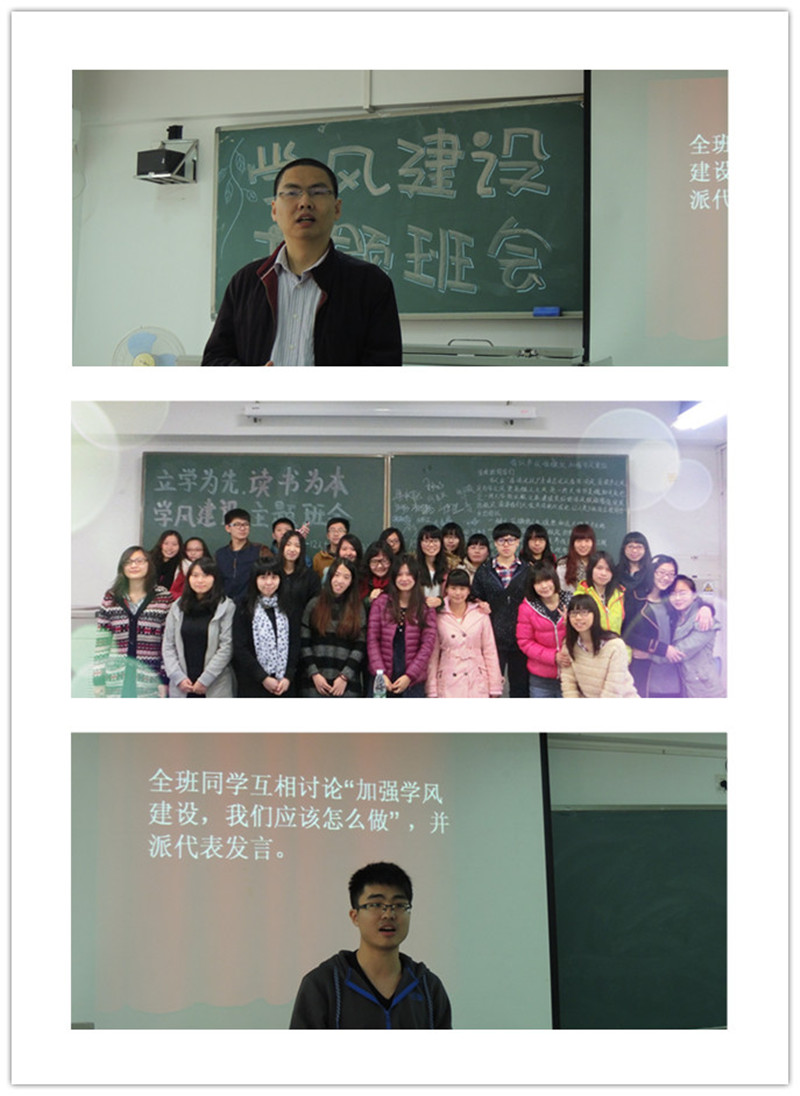 在主题班会上,同学们畅所欲言,深入讨论。同学们就端正学风如何从我做起,大学期间应该怎样阅读经典,如何进行时间管理等问题开展讨论。各班同学还在学风建设倡议书上签名支持学风建设活动。各班班长根据各班具体情况在班会上做了加强班级学风建设的工作安排,并向同学们讲解学院学风建设的具体安排。主题班会号召同学们自觉遵守学校相关制度,积极投身学习,做好大学期间的学习规划,有效利用时间。不少班级还邀请了品学兼优的师兄师姐为大家传授学习经验。