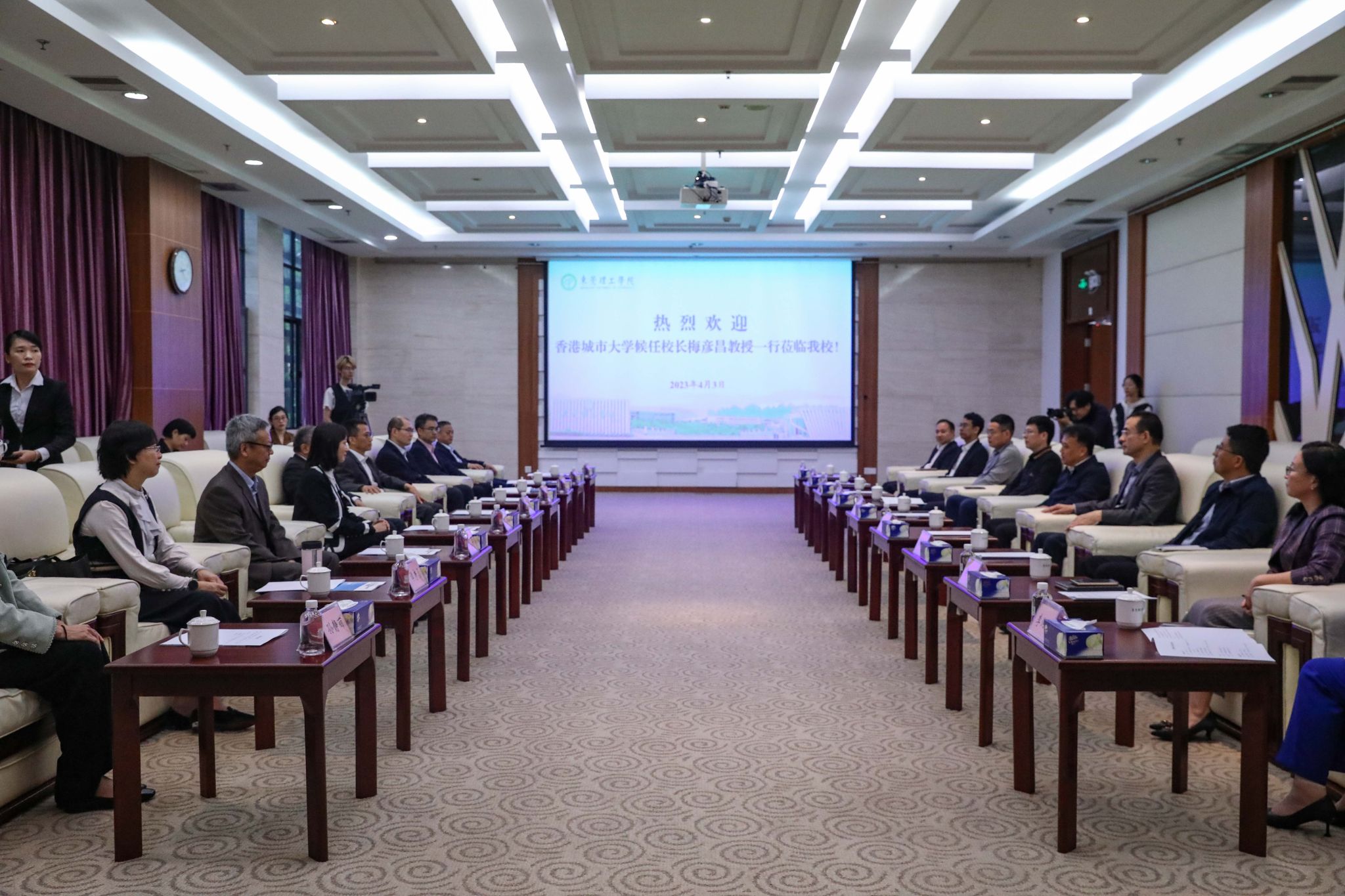 4月3日下午,香港城市大学候任校长梅彦昌教授一行到我校拜访交流,市人大常委会副主任郑国洪及大学筹建办相关负责人参加座谈会。校长马宏伟、副校长杨敏林及学校相关职能部门负责人、相关二级学院负责人参加本次交流活动。
