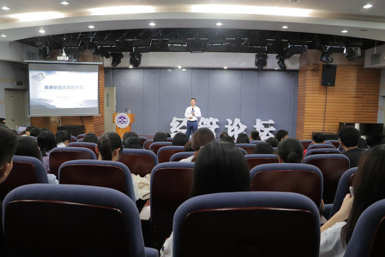 2019年10月17日下午,经济与管理学院在莞城校区小剧场举办“商事制度在东莞”经济论坛。本次论坛特邀东莞市市场监管局副调研员、国家市场监管总局特约教师张志云主讲。经济与管理学院党委书记杨继学,副院长刘川,东莞质量与品牌发展研究院副院长黄琼,经济与管理学院副教授邓念武出席了此次论坛。