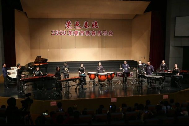 近年来,由东莞市文化馆主办并面向广大市民的迎新春音乐会已成为我市文化品牌,12月20日晚,“莞邑春晓”迎新春音乐会在东莞市文化馆星剧场精彩上演,我校教育学院(师范学院)选派的打击乐合奏节目《风暴》、《西域驼铃》作为本次音乐会重要的开场环节,其激情的表演、动感的节奏,瞬间点燃全场气氛。