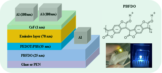 有机发光二极管具备可弯曲的特性,然而传统透明阳极ITO的使用限制了其进一步扩展柔性特性。本研究提出采用高导电聚合物聚苯并二呋喃酮(PBFDO)作为柔性透明阳极来替代传统刚性ITO,以制备基于聚合物电极的有机发光二极管。通过引入正丁醇到PBFDO导电溶液中,并调节分子间氢键相互作用,成功地获得了具有高导电性、适当功函数、优异透射率和低表面粗糙度的高质量PBFDO薄膜。基于使用PBFDO阳极的刚性和柔性发光器件均取得了令人满意的性能。
