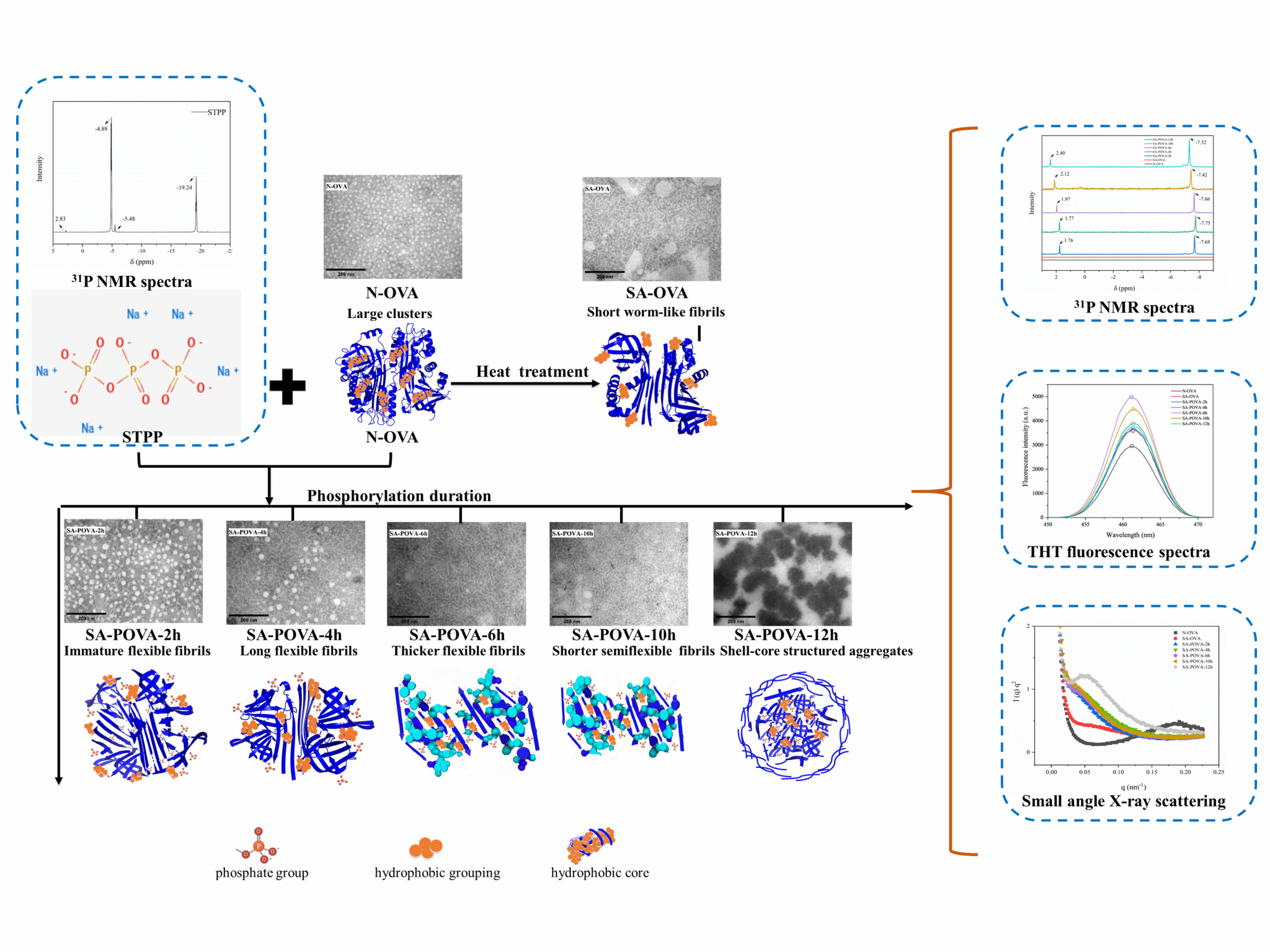 本文研究了不同磷酸化程度对卵白蛋白(OVA)自组装过程的影响。通过在pH 9.0和85°C条件下,分别进行2、4、6、10和12小时的磷酸化处理,研究了负电荷磷酸化基团作为驱动力对卵白蛋白聚集的影响。实验通过31P核磁共振和傅里叶变换红外光谱确认了磷酸基团在聚集体中的存在。通过评估活性巯基、内源荧光光谱、表面疏水性、圆二色性以及硫黄素T(THT)荧光分析了聚集过程,包括淀粉样蛋白形成。透射电子显微镜和小角度散射分析揭示了自组装过程中结构的演变,从柔性的纤维逐渐发展为更长更厚的柔性纤维,而在10小时磷酸化后形成了更短且更刚性的半柔性聚集体。在磷酸化12小时后,OVA聚集体表现出一个主要由交叉β结构组成的紧密核心,并被松散排列的无规则卷曲结构蛋白片段包围。总体而言,本研究揭示了磷酸化显著增强OVA的自组装过程,其中,静电和疏水相互作用在调控蛋白质自组装聚集体的形成中起着关键作用。