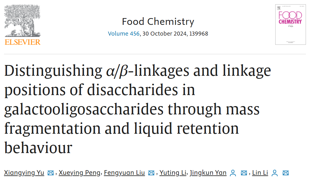 近日,我校生命健康技术学院闫景坤教授团队在国际食品顶级期刊《Food Chemistry》发表题为“Distinguishing α/β-linkages and linkage positions of disaccharides in galactooligosaccharides through mass fragmentation and liquid retention behaviour”的研究性文章。生命健康技术学院余祥英博士为第一作者,闫景坤教授为通讯作者。